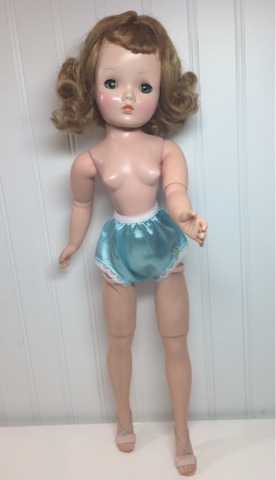 Cissy a few age related issues, but nothing too hard to fix. She needed re-stringing and some split repairs. One side of her face was cracked along the seam and her legs had hip splits at the tops so I repaired them, but neither of these are really visible unless you pull her hair out of the way or pull her hips out of the sockets. The most visible issue was a gouge in her breast. I repaired it with epoxy and re-painted it. Then I styled Cissy's gorgeous, thick blond hair, gave her a partial eyelash replacement, and refreshed her cheek blush and painted lashes and now she's just as pretty as she was in her youth.