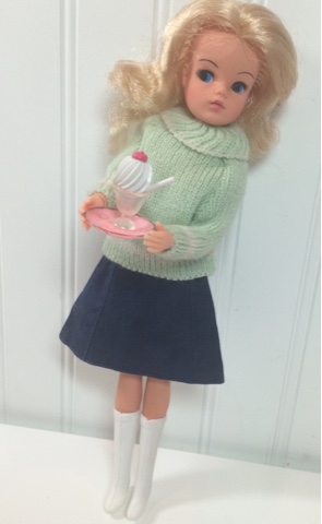 Ever-popular Sindy meets her friends at the soda shop after school. She's adorable in her cowl-neck acrylic sweater and blue twill A-line skirt, original to her logo outfit. Her go-go boots are the perfect choice again. Sindy's pink gold-edged plate and milkshake are included in her set.