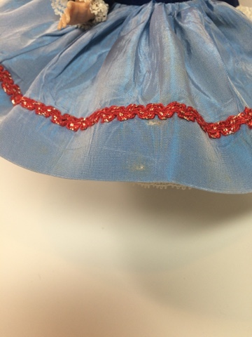I chose a blue dress tagged "Dutch" for Muffie because the colors bring out her sapphire blue eyes. It's beautifully detailed: the neckline hearkens back to Vermeer's models, and the bodice and taffeta skirt are trimmed with all sorts of soutache braid, ethnic woven flat ribbon, and lace. The only flaws are a couple spots on the skirt.