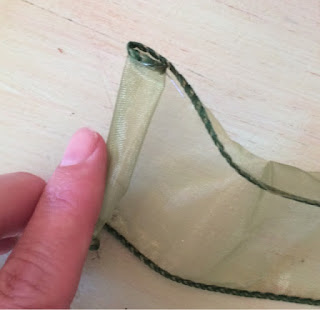 Begin by making the sleeves. Fold over the edge of the wired ribbon. The larger your doll the wider the wired ribbon you will need.